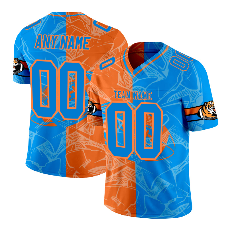 Personalized orange and blue patchwork American football jersey