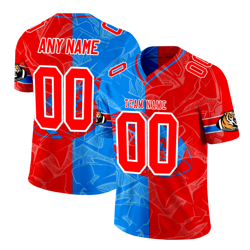 Personalized red and blue patchwork American football jersey