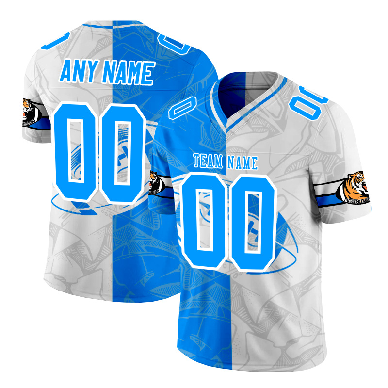 Personalized blue and white patchwork American football jersey