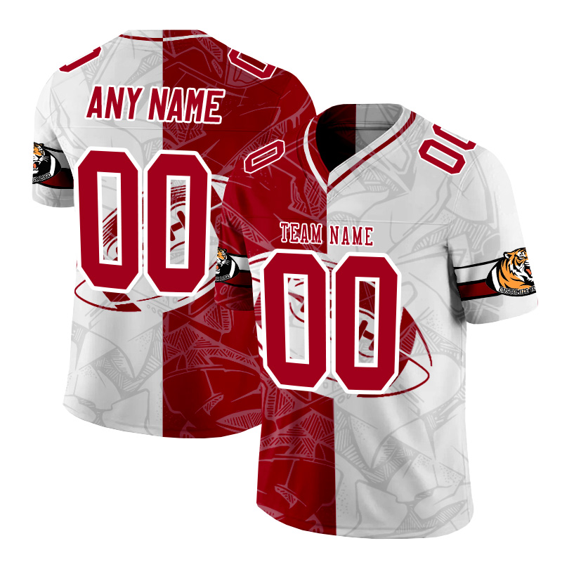 Personalized dark red and white patchwork American football jersey
