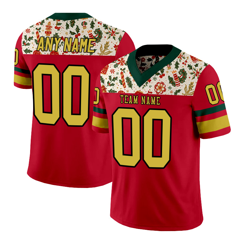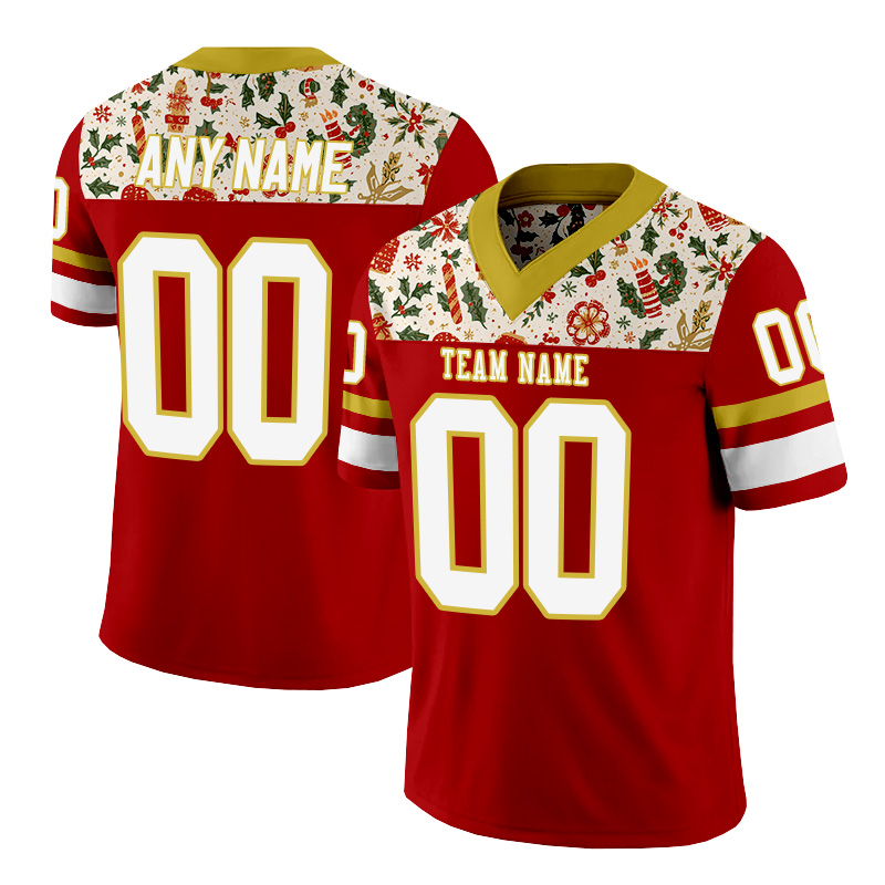 Personalized red, gold, and white Christmas-style American football jersey
