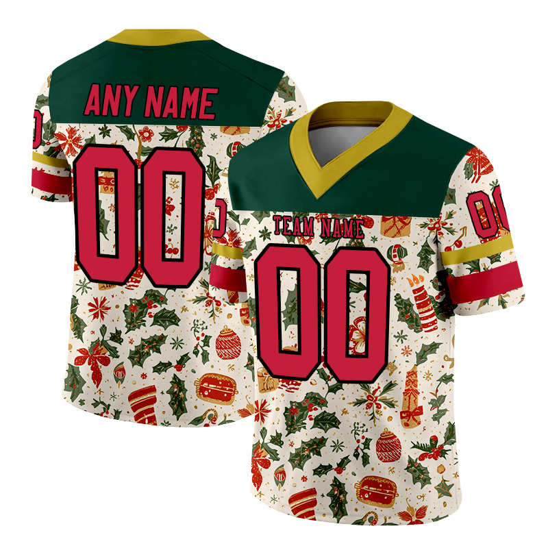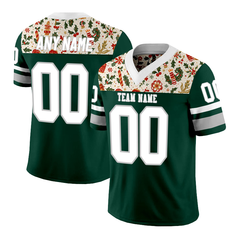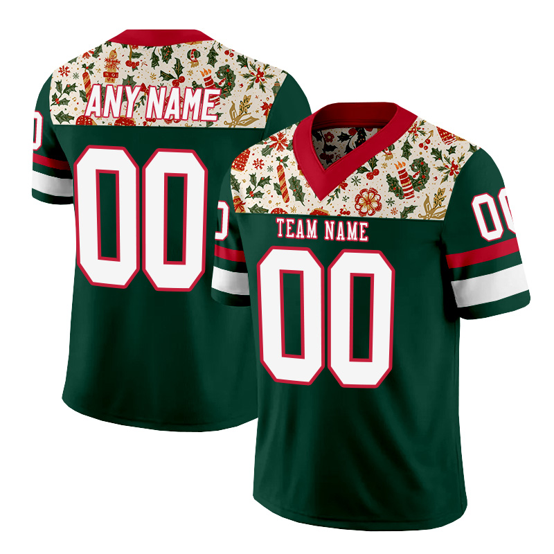 Personalized green, red, and white Christmas-style American football jersey