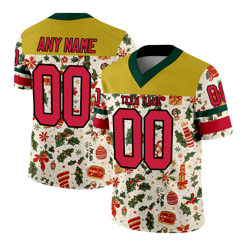 Personalized Christmas-themed yellow, red, and green American football jerseys