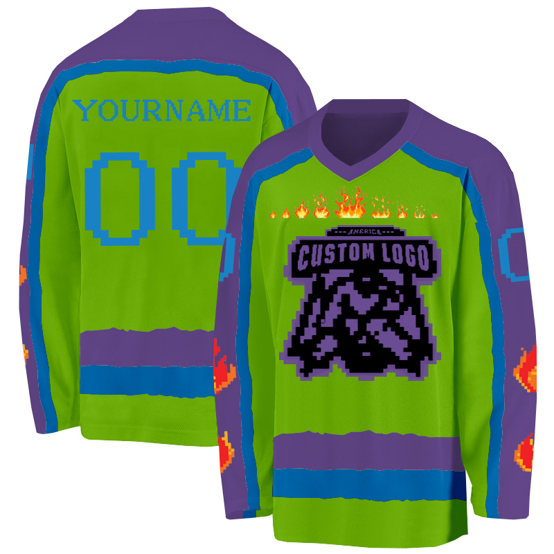 Personalized Flame Pixel Style Green, Purple and Blue Hockey Jersey