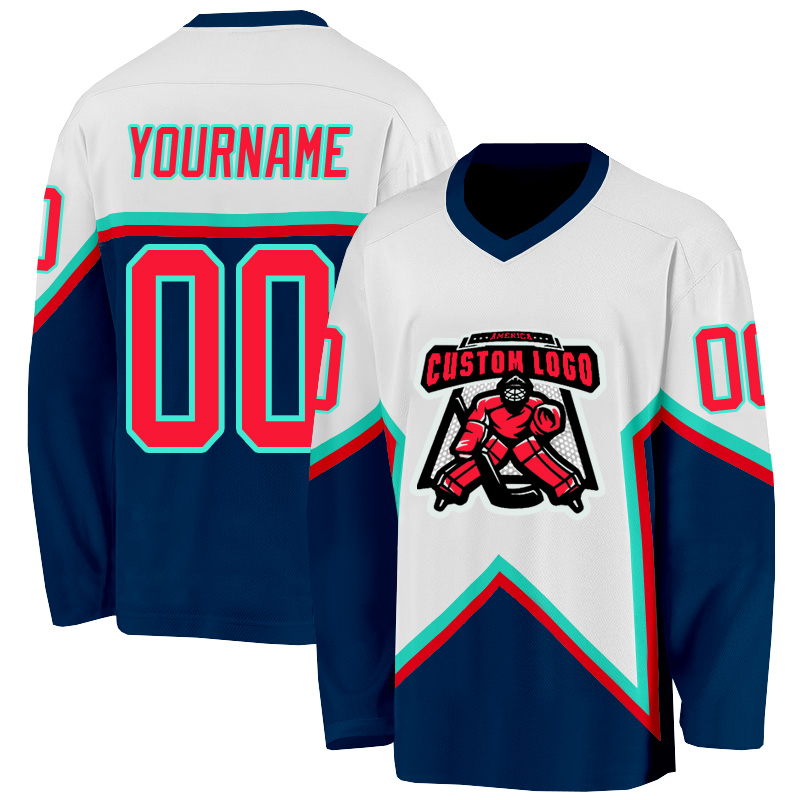 Personalized white, blue, black, cyan, star and stripe ice hockey jersey