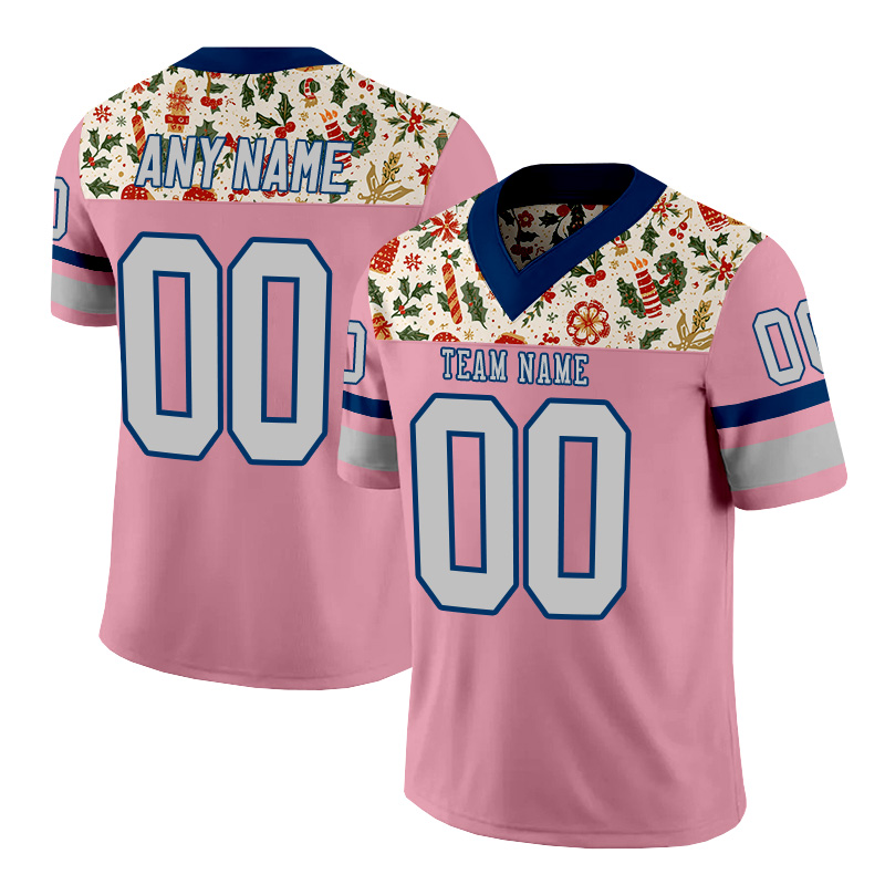 Personalized pink, silver, and blue Christmas-themed American football jersey